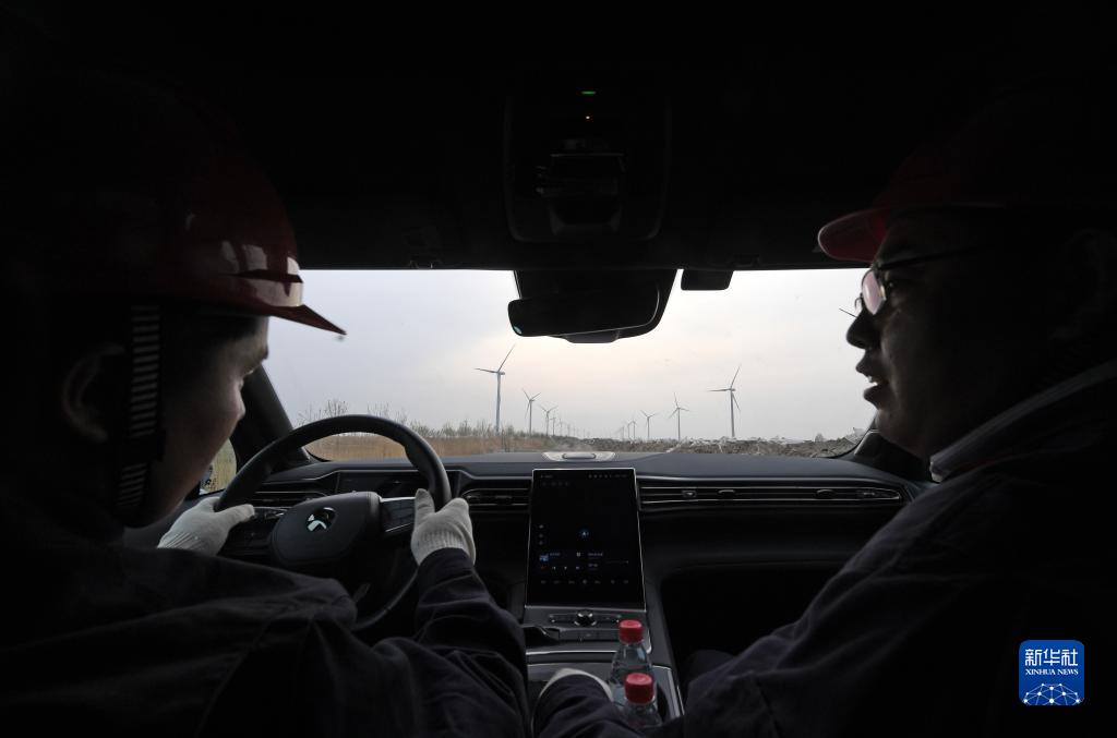 在位于天津市滨海新区的国家能源集团龙源电力马棚口风电场,刘彦波(右)和同事胡众银乘车前往一风电机组进行检修作业(4月12日摄)。