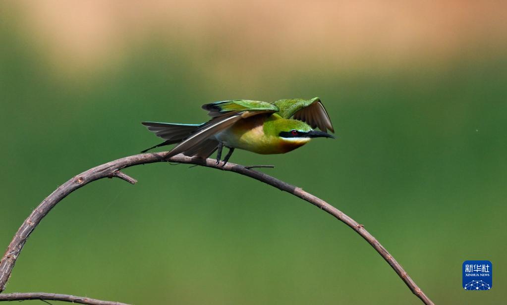 在海口五源河下游蜂虎保护小区,栗喉蜂虎在树枝上起飞(4月15日摄)。