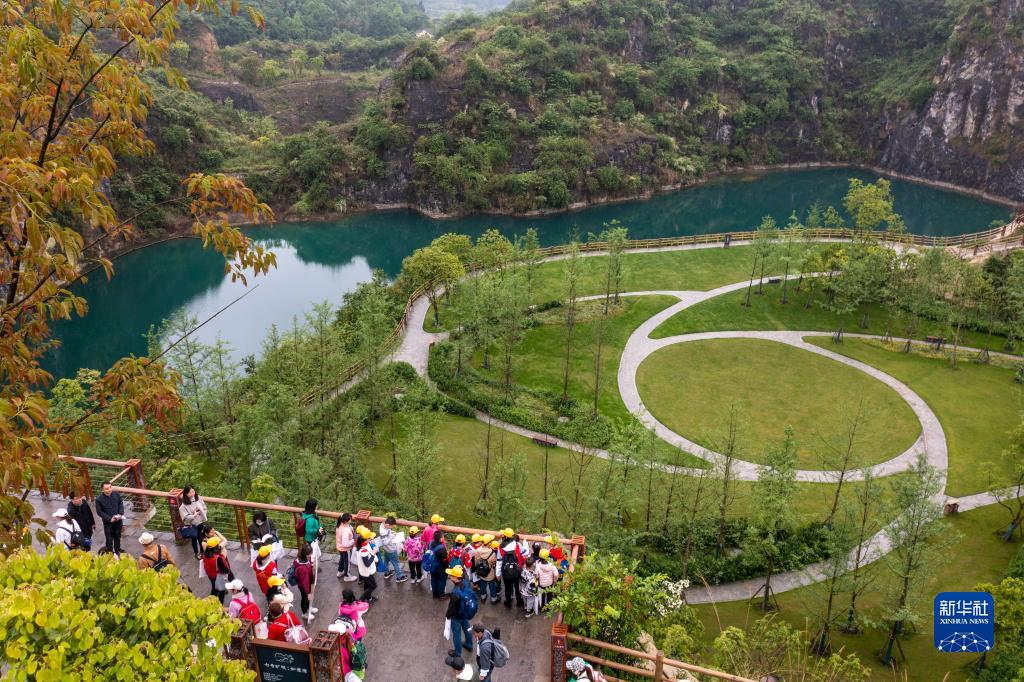 4月17日,地学旅游爱好者、中小学生和部分媒体工作者在地质专业工作人员的带领下,对铜锣山矿山公园的地质遗迹和生态修复进行科学考察(无人机照片)。