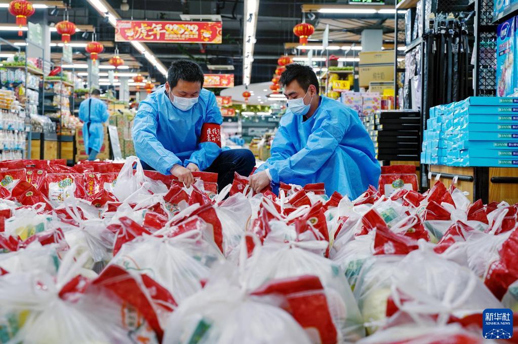 4月17日,上海市奉贤区西渡街道社区发展综合服务中心的工作人员入驻超市,承担分拣配货等工作。