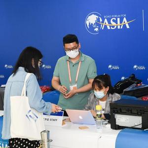 4月18日,工作人员在博鳌亚洲论坛年会注册中心工作。