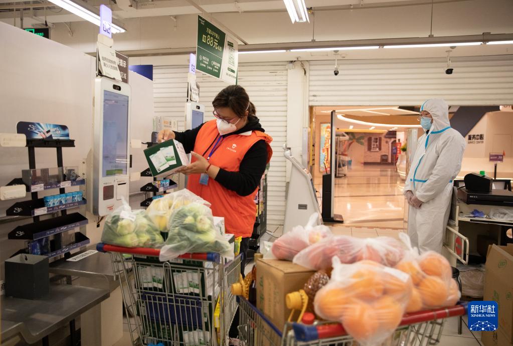 4月17日,广福居委会工作人员许雯静(左)在超市结账。