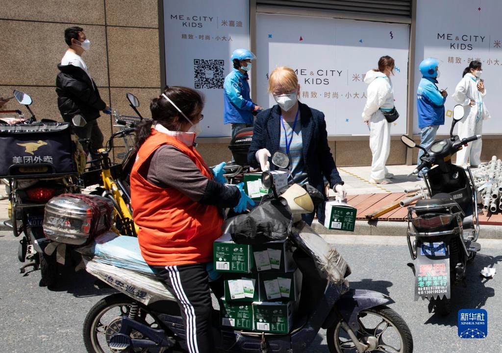 4月17日,广福居委会工作人员陈艳(前左)、俞静芳(前右)把物资装上电动车,准备运回居委会。