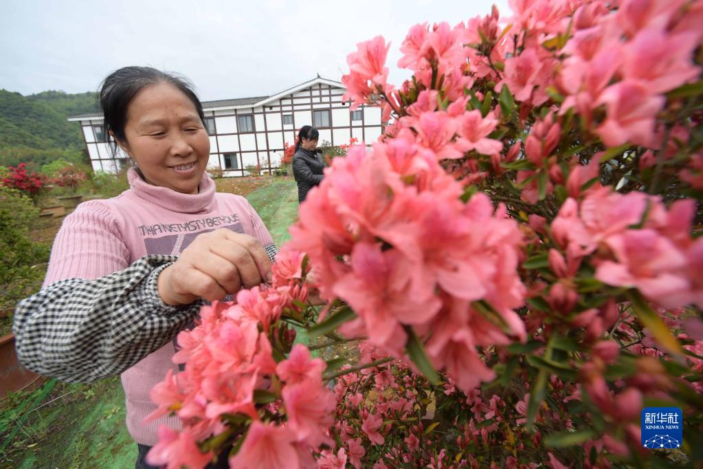 4月18日,村民在桐梓县娄山关街道杉坪村黔北花海景区杜鹃花种植基地劳作。