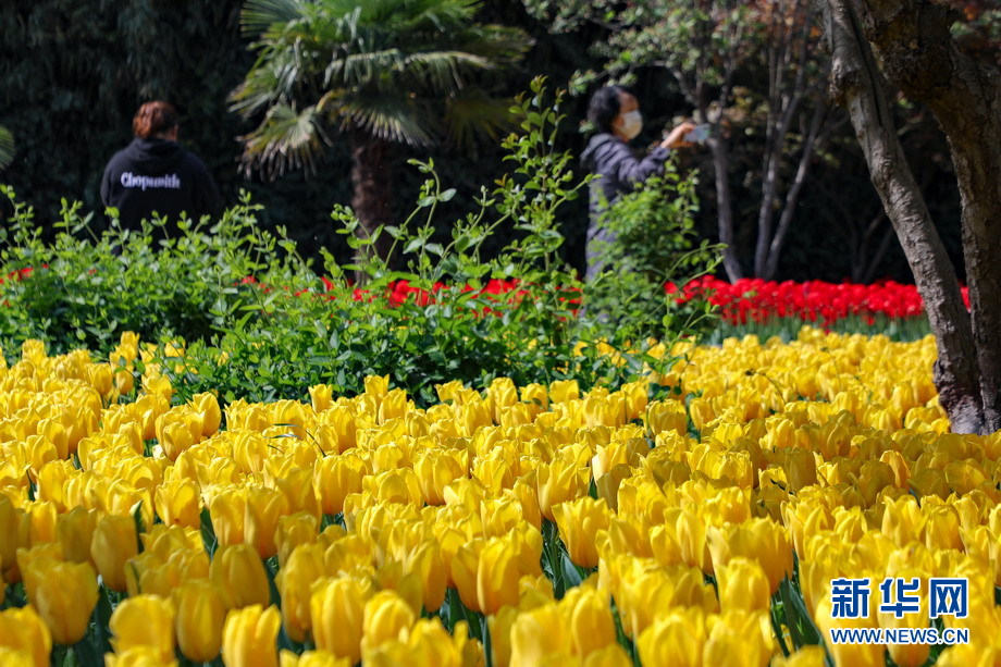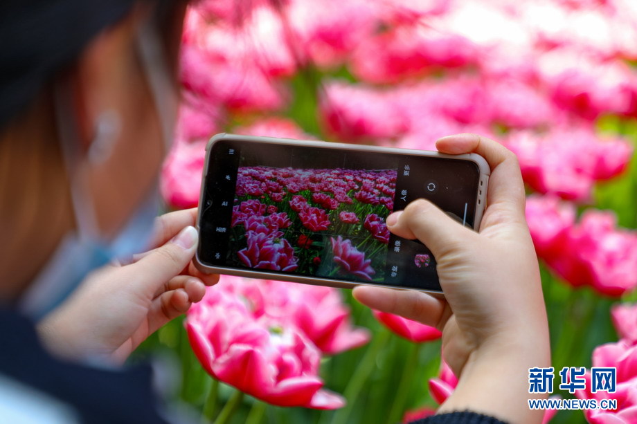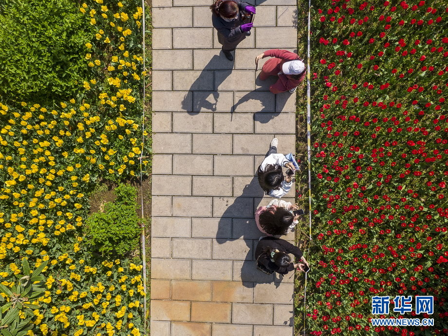 4月15日,河南省安阳市人民公园盆景园内第九届郁金香花展18个品种、8万余株郁金香娇艳绽放。斑斓的郁金香花海,随着春风摇曳生姿,游客漫步园内,陶醉其中。新华网发(麻翛然 摄)