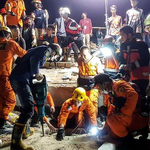 4月19日,救援人员在印尼南加里曼丹省的建筑倒塌事故现场搜救。
