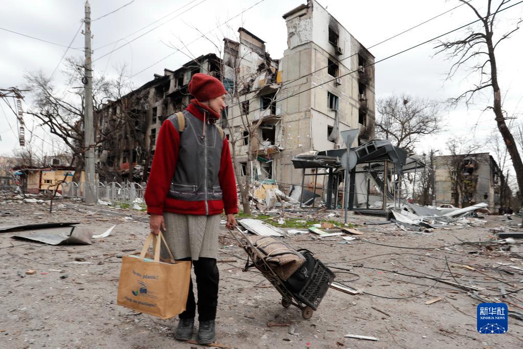 4月18日,在马里乌波尔,当地居民走过被损坏的建筑。