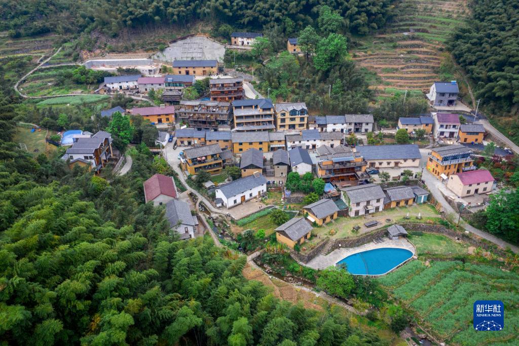 4月18日拍摄的浙江桐庐先锋云夕图书馆和周围建筑(无人机照片)。