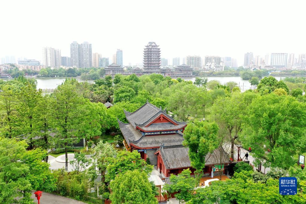 眉山知行·阅读坊湿地公园人文书店掩映在绿树之中(4月18日摄,无人机照片)。