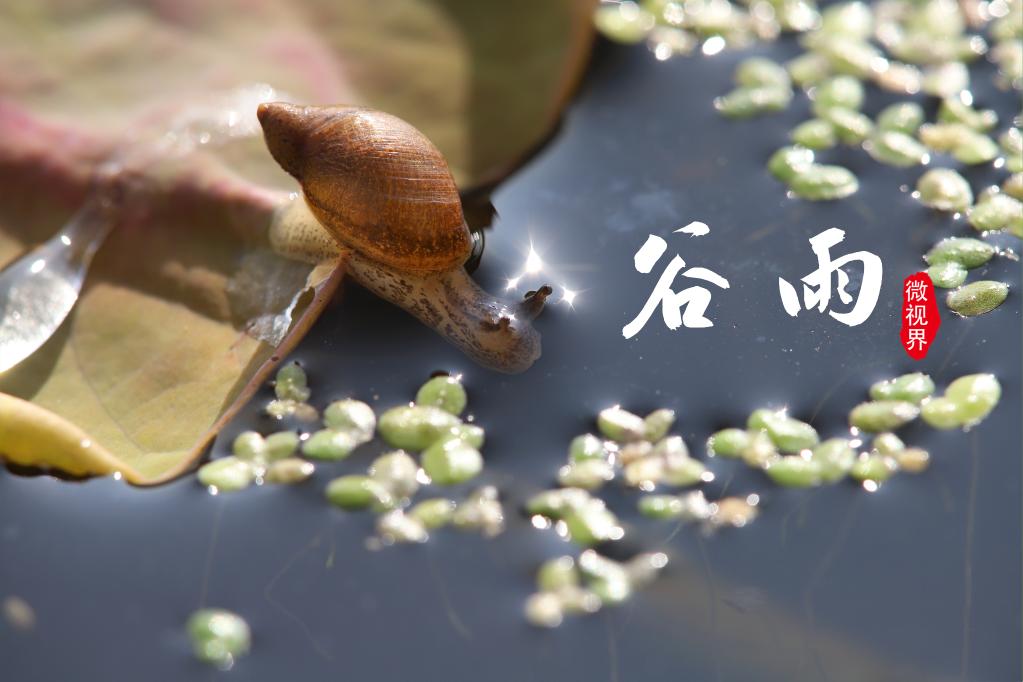 4月16日,云南省曲靖市沾益区金龙街道云龙社区蓄水充盈的荷塘里,一只蜗牛在荷叶上将头伸到长出浮萍的水中。
