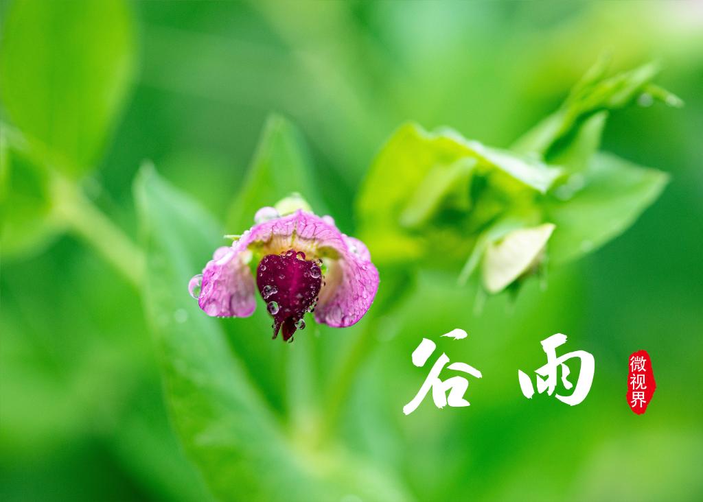 4月16日,陕西省略阳县徐家坪镇周家坝村地里的豌豆花蕊在雨水的滋润下晶莹剔透,格外娇艳。