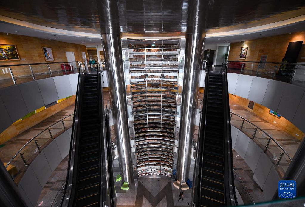 这是4月19日在印度尼西亚雅加达拍摄的印度尼西亚国家图书馆内的一面书墙。