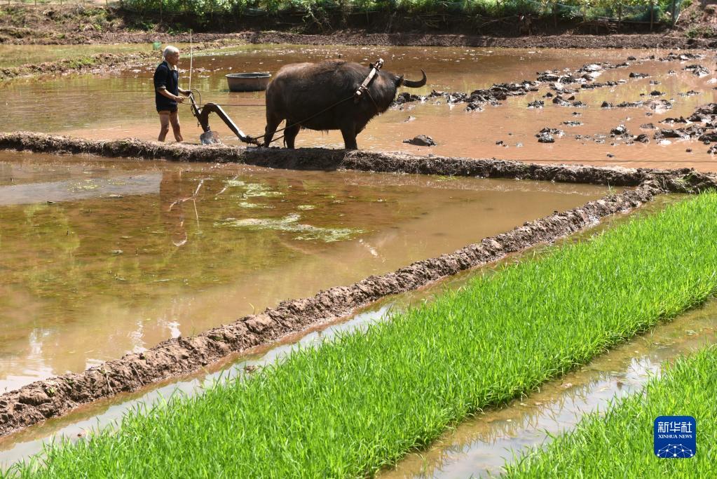 4月19日,四川省内江市高梁镇新牌坊村村民在赶牛耕田。