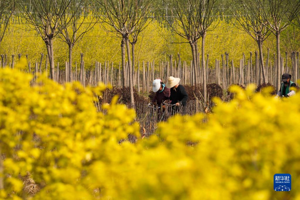 4月18日,农民在河北省遵化市新店子镇西苇店村的苗圃松土(无人机照片)。