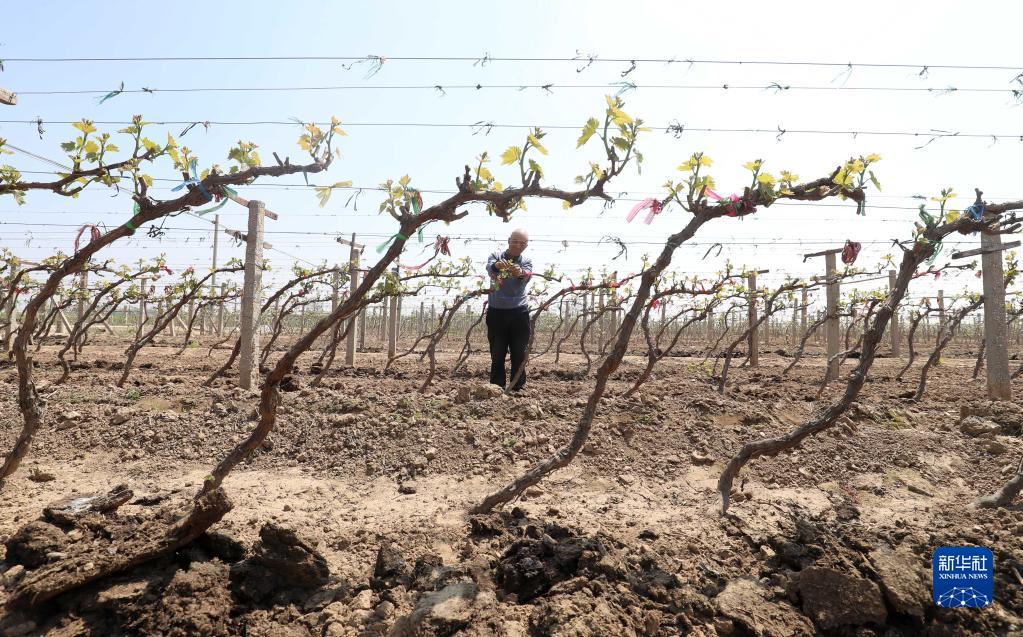 4月19日,在河北省石家庄晋州市桃园镇周头村,农民在管护葡萄树。