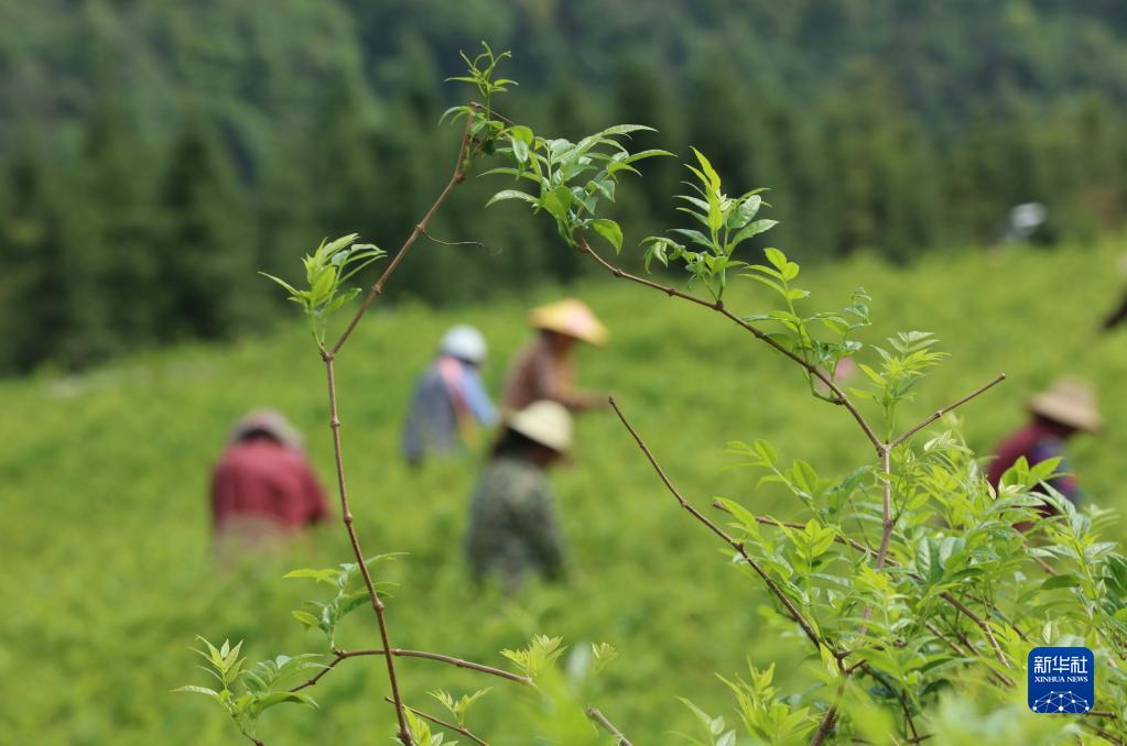 4月19日,在湖南张家界市武陵源区金杜村莓茶种植基地,茶农在采摘鲜叶。