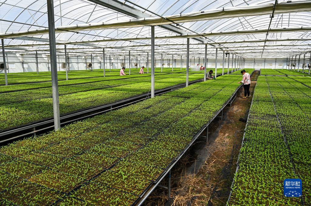 4月19日,在内蒙古达拉特旗白泥井镇金泰禾公司育苗基地,员工们在清理杂草。