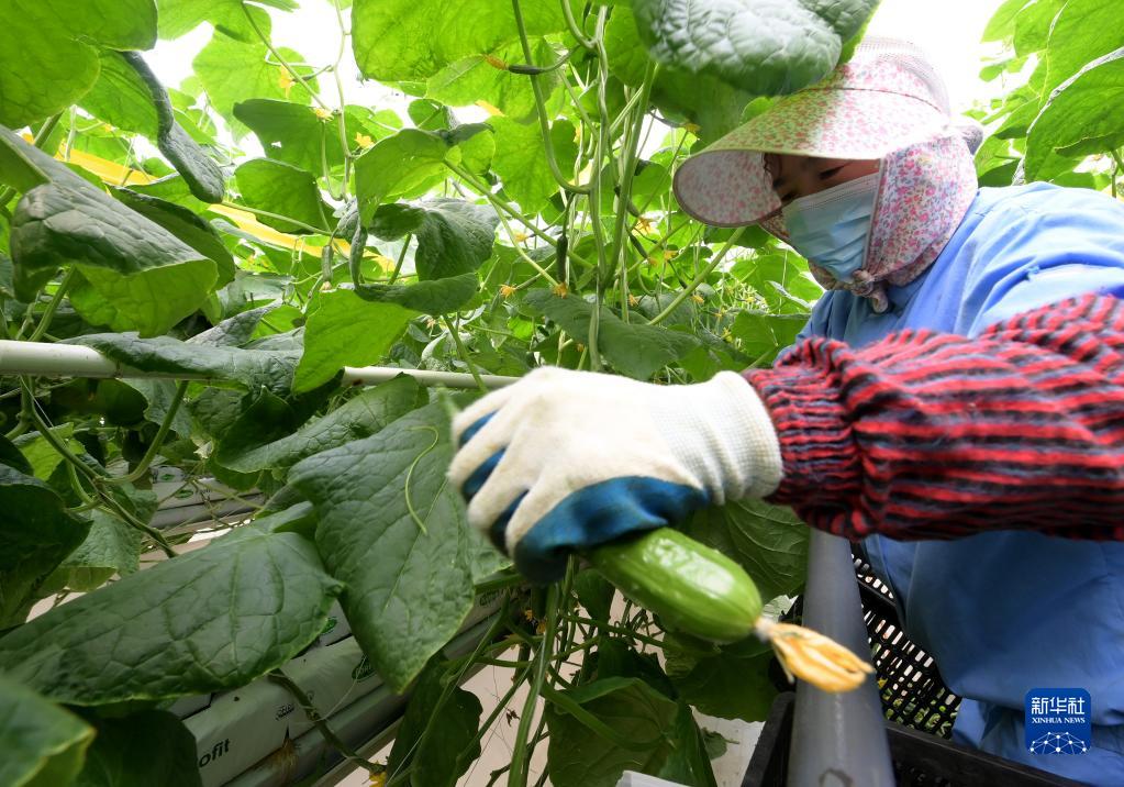 在上海由由农业科技公司位于崇明区中兴镇的种植基地内,工作人员在采摘黄瓜(4月19日摄)。