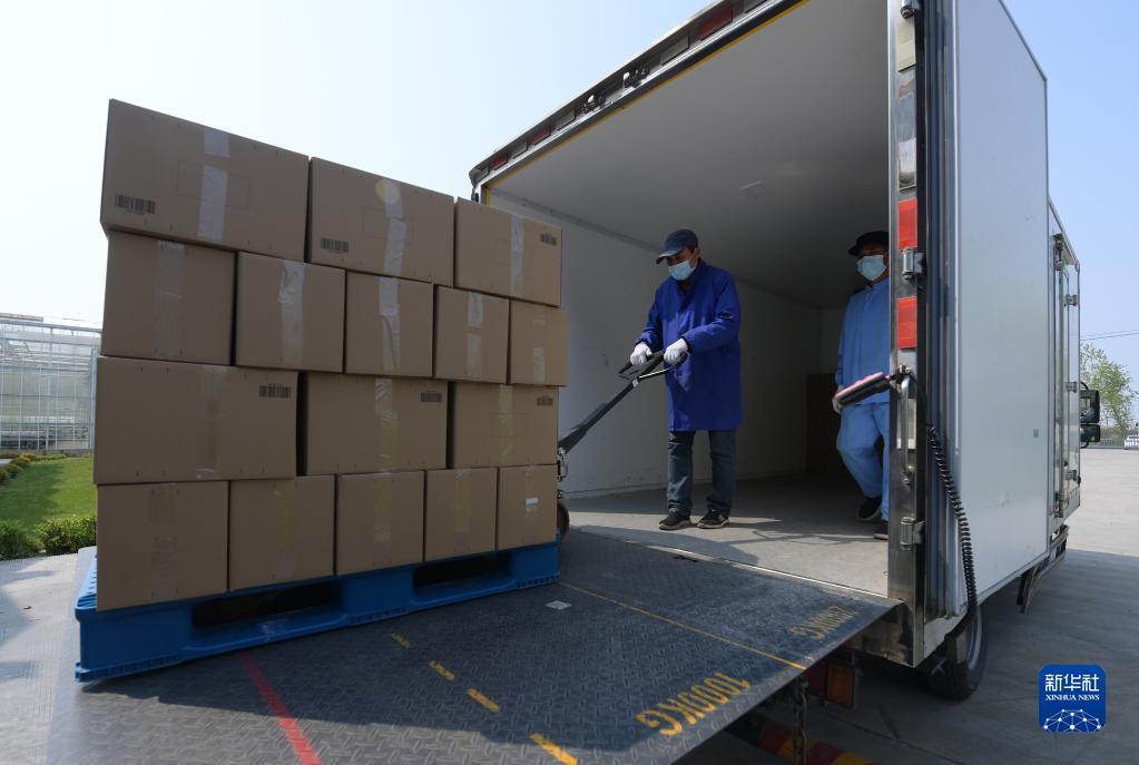 在上海由由农业科技公司位于崇明区中兴镇的种植基地内,工作人员将包装好的蔬菜装车,准备送往市区(4月19日摄)。