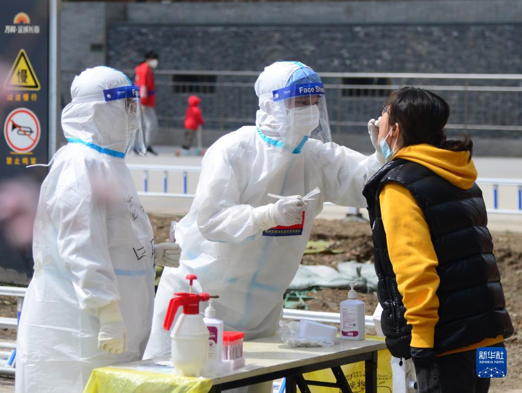 4月20日,在长春市一处核酸检测点,居民接受核酸检测采样。