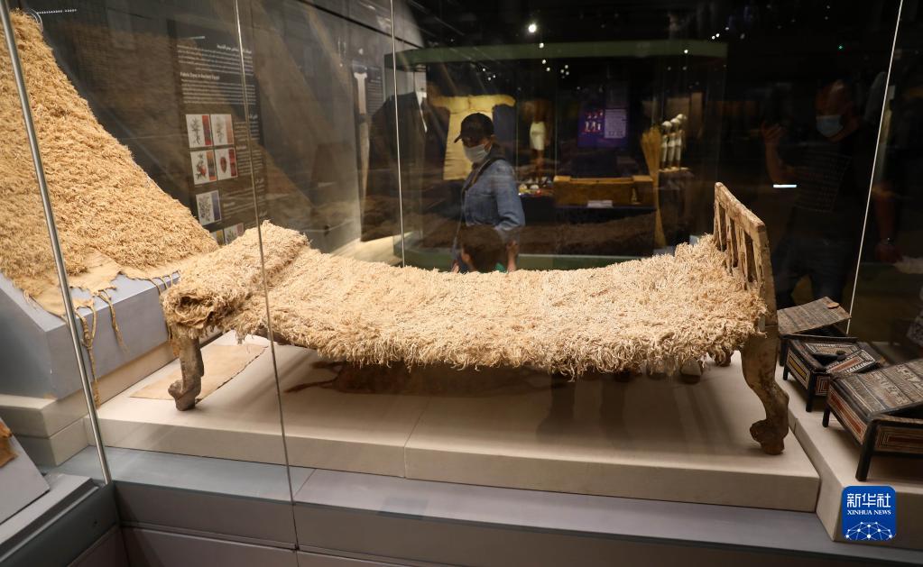 4月19日,游客在位于埃及首都开罗的埃及文明博物馆纺织品馆参观古代床上织物用品。