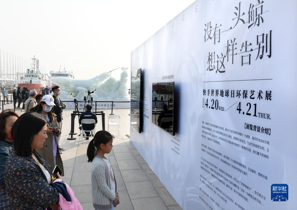 4月20日,游客观看“没有一头鲸想这样告别”环保艺术展介绍。