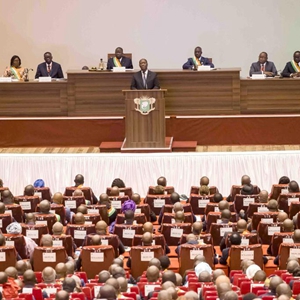 4月19日,科特迪瓦总统瓦塔拉在科政治首都亚穆苏克罗发表讲话。
