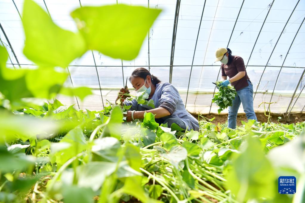 4月20日,农民在河北省石家庄市行唐县东安太庄村大棚里进行红薯剪秧。