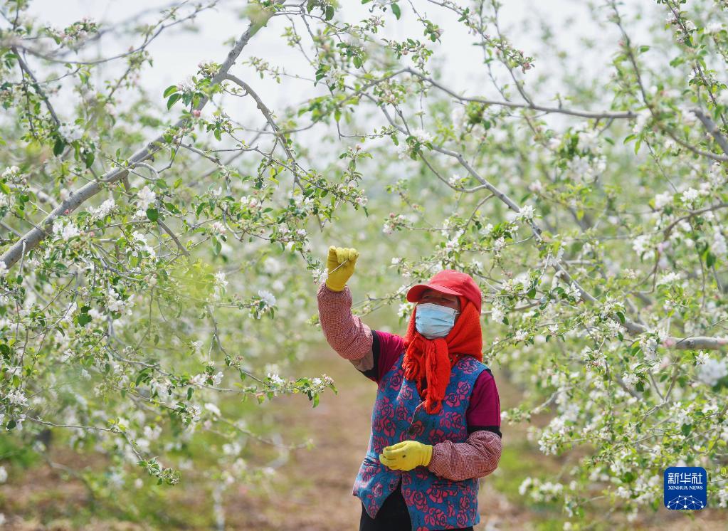 4月20日,农民在山东省胶州市铺集镇苹安果家庭农场为苹果树授粉。