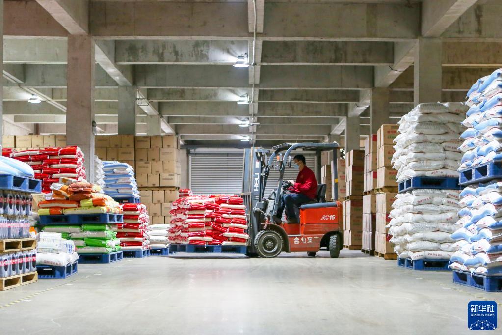 4月20日,工作人员在鞍山一家商贸有限公司仓库内运输保供粮品。
