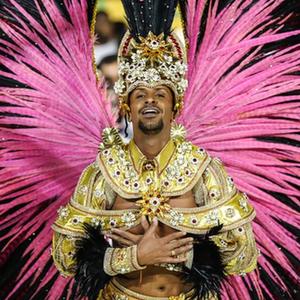 4月20日,在巴西里约热内卢桑巴大道,一名桑巴舞校的演员参加狂欢节游行。