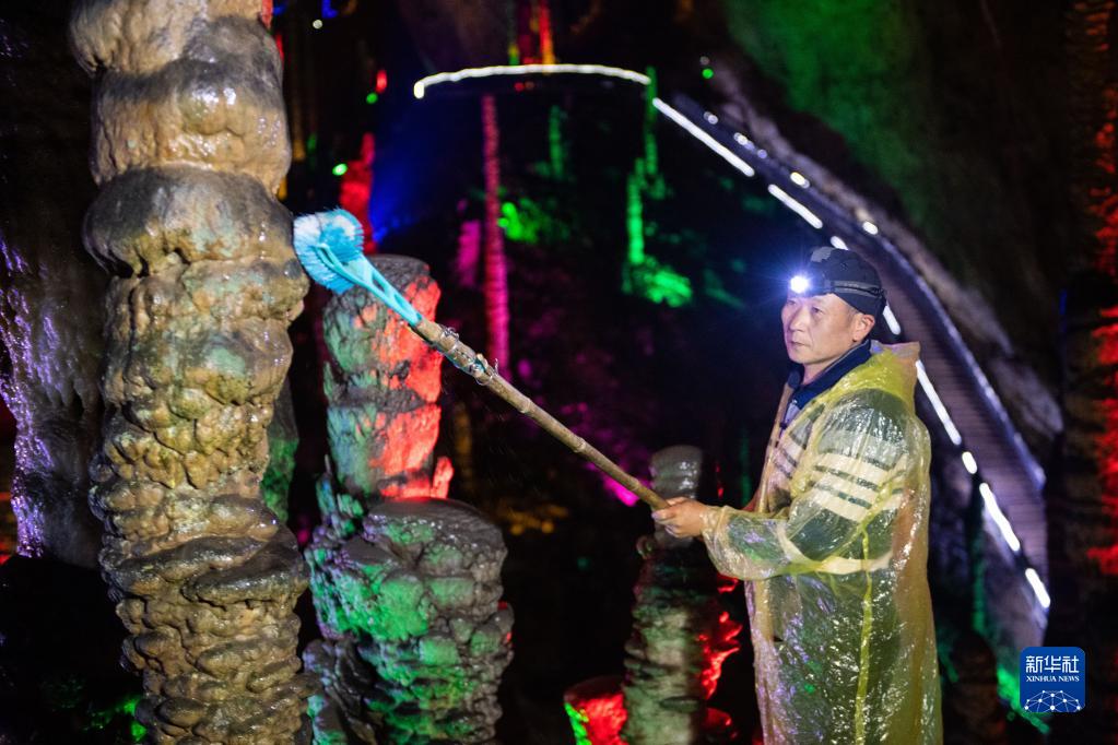 在湖南省张家界市武陵源区黄龙洞景区有一群钟乳石“美容师”,他们定期对钟乳石上的苔藓和其它杂物进行清理,呵护钟乳石的自然生长,让它们以良好的状态展现在游客眼前。