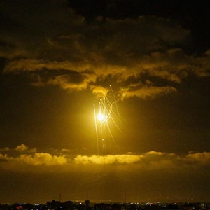 4月21日,以色列“铁穹”防御系统发射出的导弹划过加沙城的夜空,拦截从加沙地带发射的火箭弹。