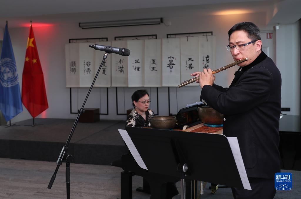 4月20日,在位于法国巴黎的联合国教科文组织总部举行的中文日活动上,旅法长笛家王伟(右)、钢琴家侯娟演奏《山水》。