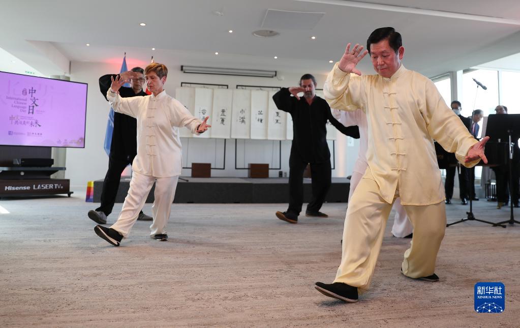 4月20日,在位于法国巴黎的联合国教科文组织总部举行的中文日活动上,中外人士表演太极拳。