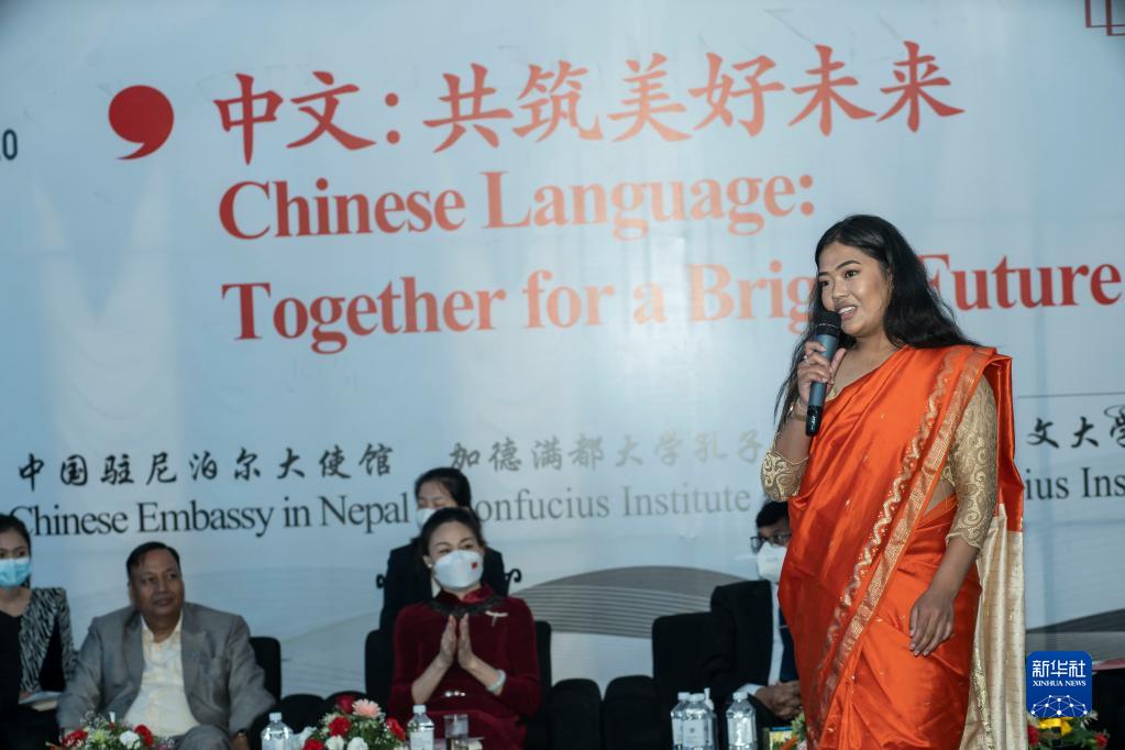 4月20日,在尼泊尔加德满都举行的联合国中文日庆祝活动上,尼泊尔学生演唱中文歌曲《桥边姑娘》。
