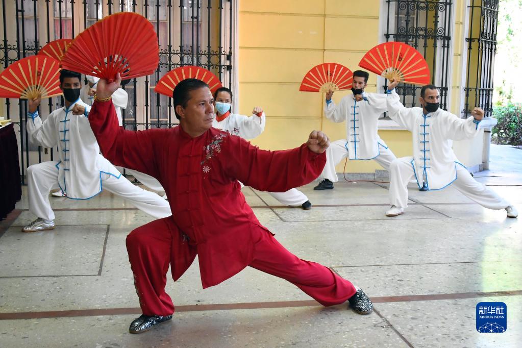 4月20日,在古巴哈瓦那,古巴武术和气功学校校长李荣富(前)在中国驻古巴大使馆“中文日”主题活动上表演武术。