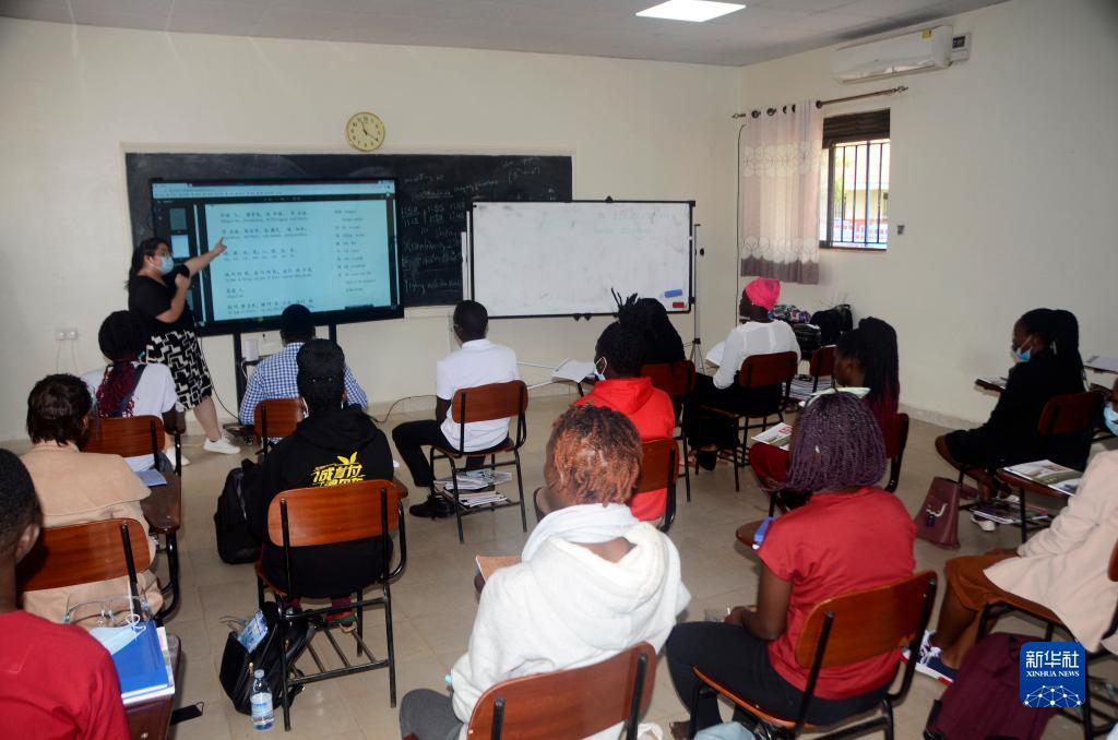 4月20日,在乌干达瓦基索,一名教师在庆祝联合国中文日的活动中教授中文。