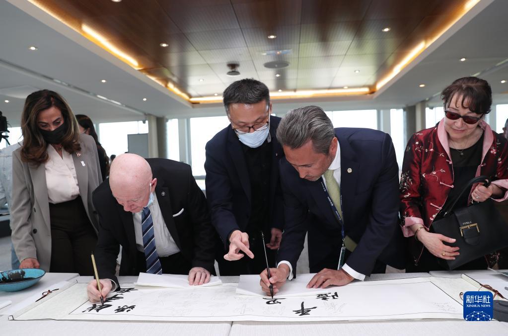 4月20日,在位于法国巴黎的联合国教科文组织总部举行的中文日活动上,多国常驻联合国教科文组织外交官共同书写中文长卷“战争起源于人之思想,故务需于人之思想中筑起保卫和平之屏障”。