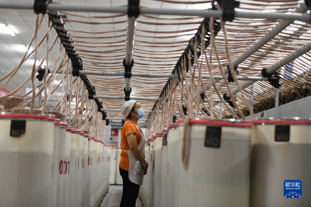 4月21日,在位于石家庄市藁城区的一家化纤有限责任公司车间内,工人在纺纱。