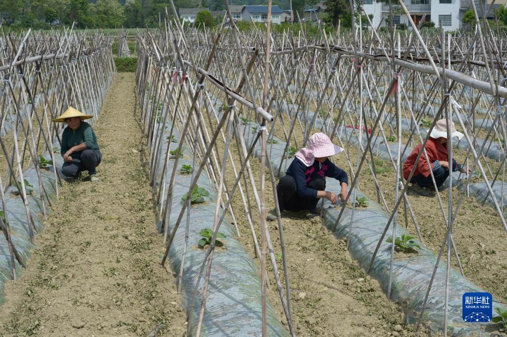 4月21日,村民在贵州省绥阳县风华镇银堡坝区管护金瓜苗。
