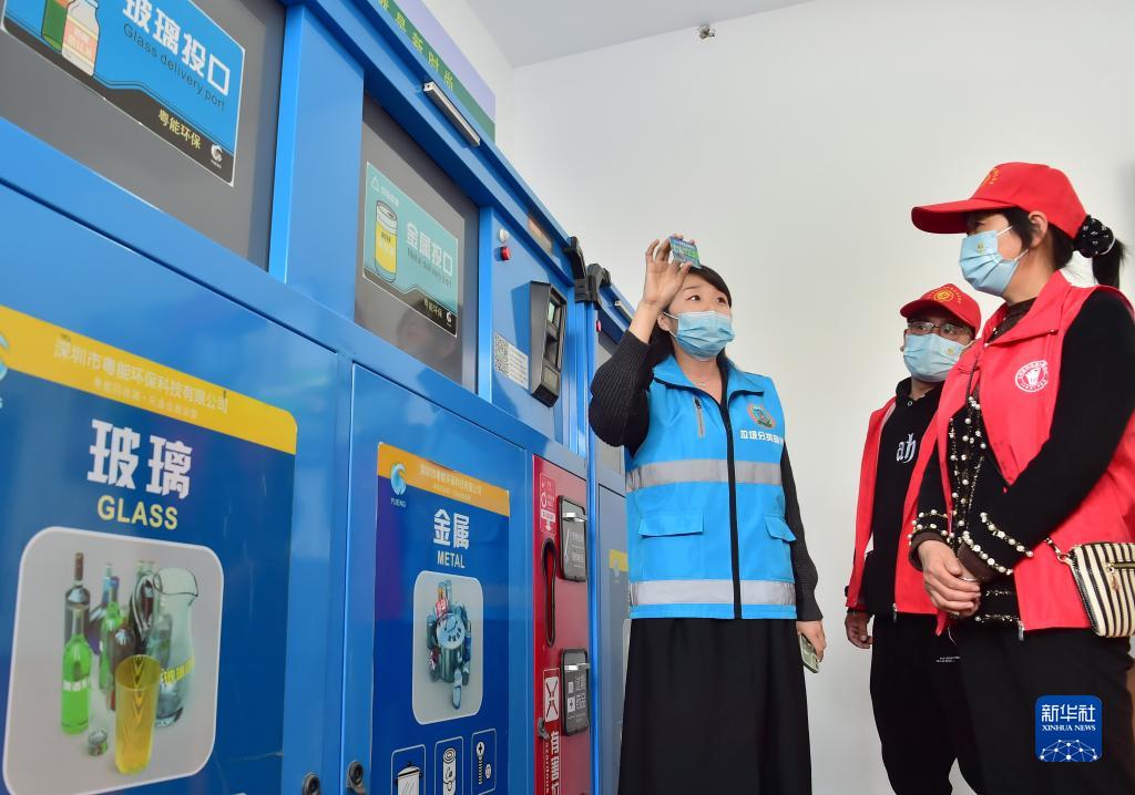 4月21日,在河北省石家庄市鹿泉区镇宁路上的一家生活垃圾分类活动驿站,工作人员为社区志愿者讲解垃圾分类知识。