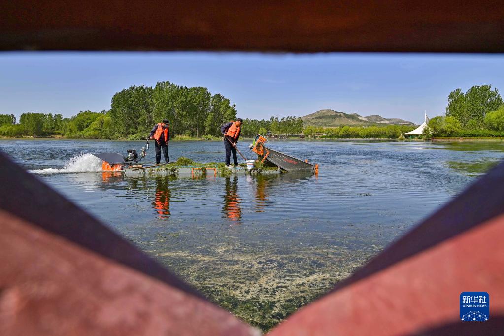 4月21日,在山东省青州市尧王湖,工作人员清理水草和垃圾。