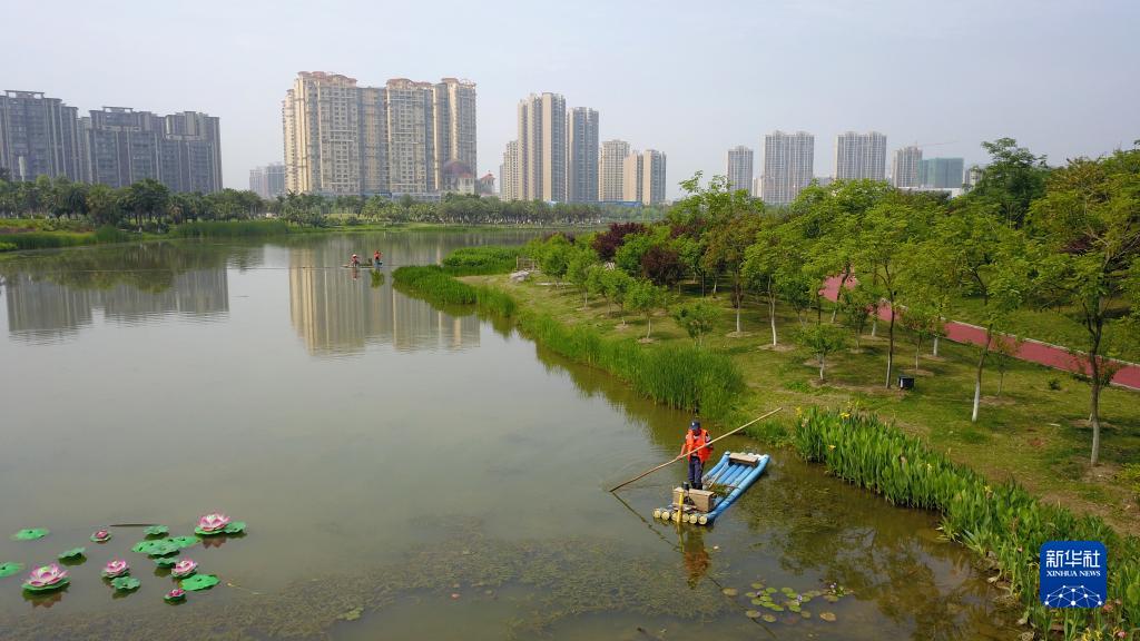 4月21日,环卫工人在广西贺州市爱莲湖公园划乘小船清理湖面漂浮物(无人机照片)。