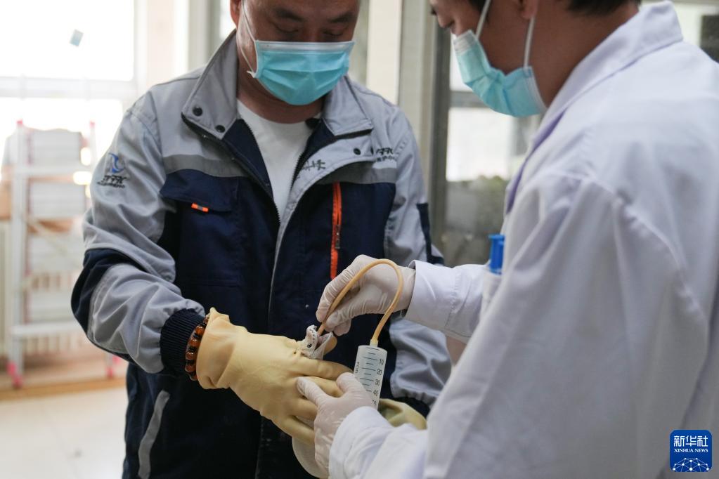在北京市野生动物救护中心,刘醴君(右)在同事的配合下为一条白化球蟒治疗(4月20日摄)。