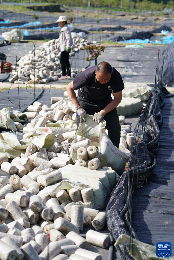 4月21日,老庵寺村村民在地里整理木耳菌棒。