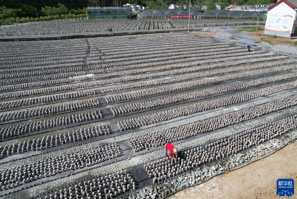 农民在柞水县小岭镇金米村查看地栽木耳长势(4月21日摄,无人机照片)。