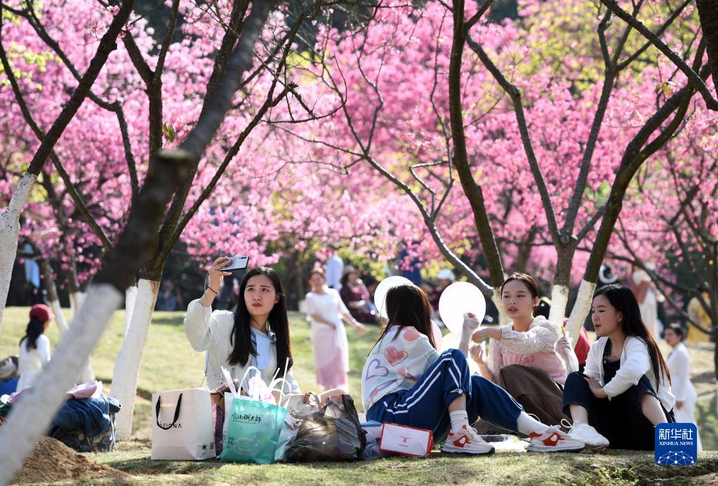 在广西南宁市石门森林公园,市民、游客在赏花、游玩(3月7日摄)。