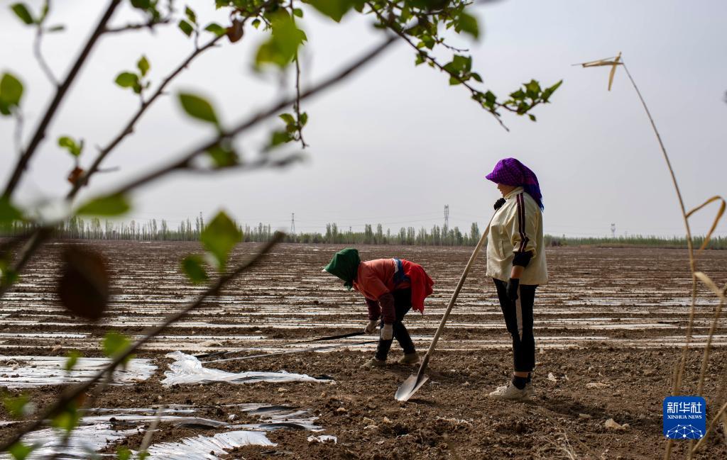 伊力·买买提的妻子赫妮排姆·库尔班(左)在棉田整理滴灌带,在石河子市工作的大女儿趁着休息回到家中帮忙(4月19日摄)。