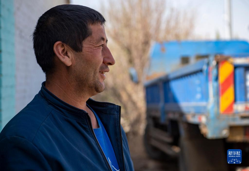 伊力·买买提在位于沙湾市乌兰乌苏镇三宫店村的家门口休息(4月17日摄)。